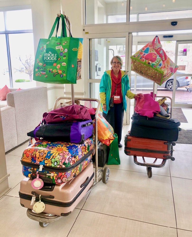 And then the week was over—goodbyes and hugs are always bittersweet. Travel plans were adjusted for potential blowing snow on an early morning drive next day to the Albuquerque Airport. Darlene and her husband Len, had similar timing for flights so we all packed up and left for an airport hotel as soon as the last day of class ended. We made a colorful entrance, below, with our (most of mine are partially packed) belongings balanced and swaying on the carts. And yes, that’s my flowered suitcase, impossible to miss at baggage claim.