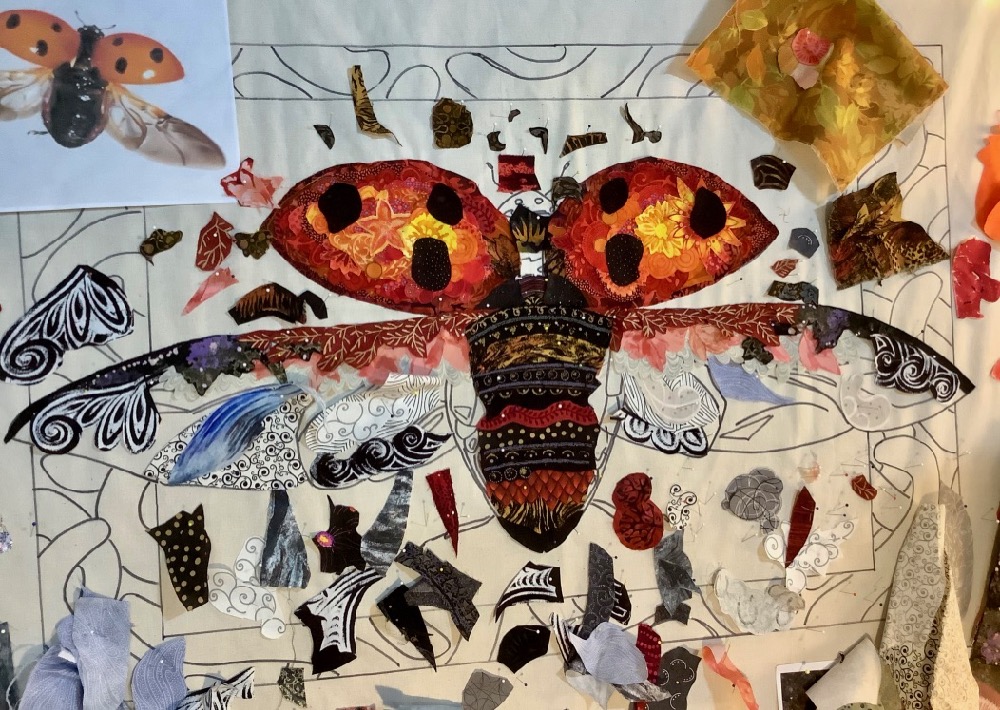 Nancy is from Alford, Massachusetts, is quite fond of her gardens and very appreciative of her garden “helpers”—the ladybugs and earthworms. With this collage, she is on her way to immortalizing them with a big and bold ladybug, and a (future) border of wriggling earthworms. Nancy’s goal is to work with light and dark values in her fabrics, including sheer fabrics, to create visual depth to her creatures.