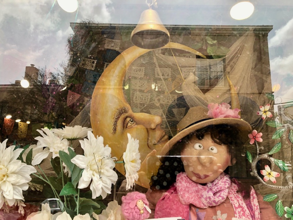 Reflections off windows at a particular gallery of art from Oaxaca, Mexico, below. In 2022, I came home with a small yet colorful crocodile. This visit I only had the chance to gaze into their windows, admiring the highly patterned designs on some of my favorite creatures, and checking out reflections.