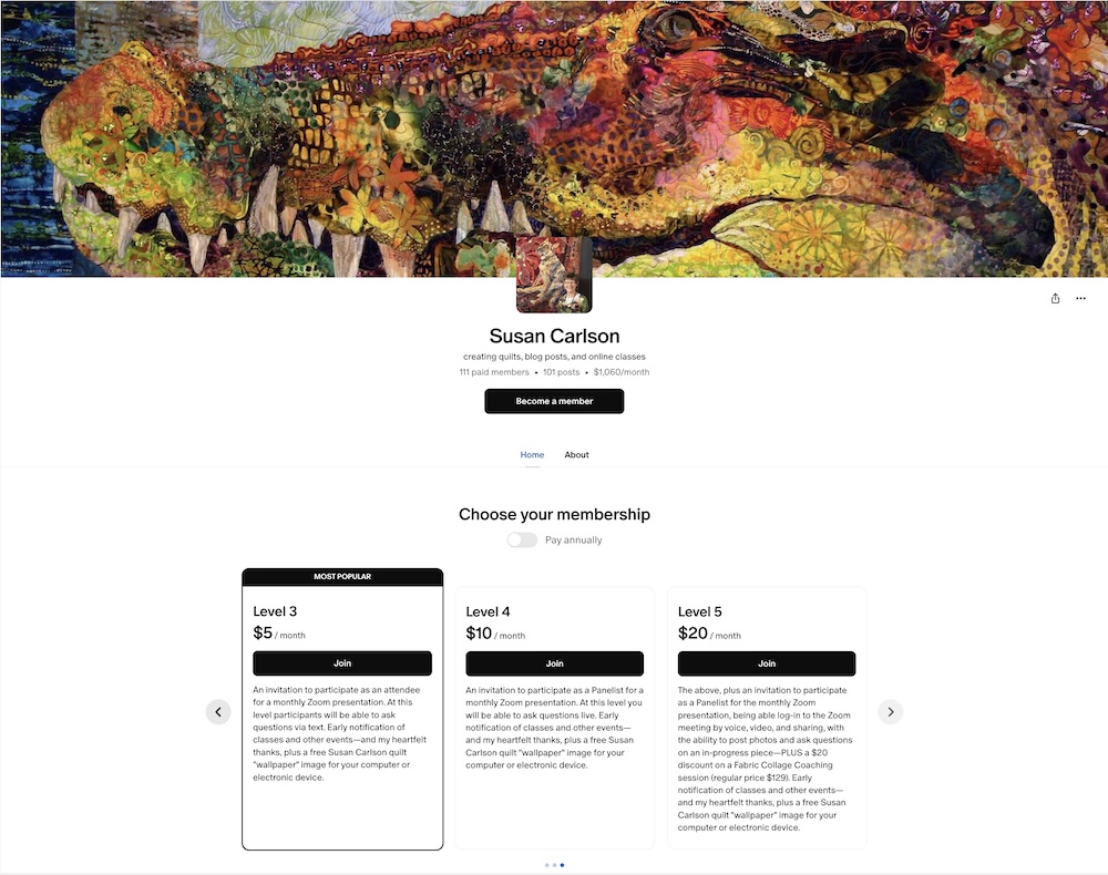 Contributions through Patreon.com help support the weekly production of the susancarlson.com blog. Each week for over eight years we’ve produced new content and provided news of fabric collage learning opportunities. This information is free to all. Sign up for a blog subscription, and have it mailed weekly to your in-box.