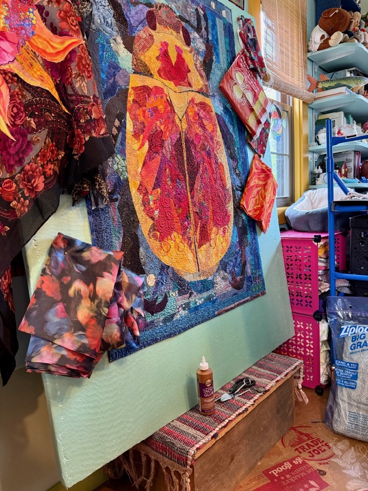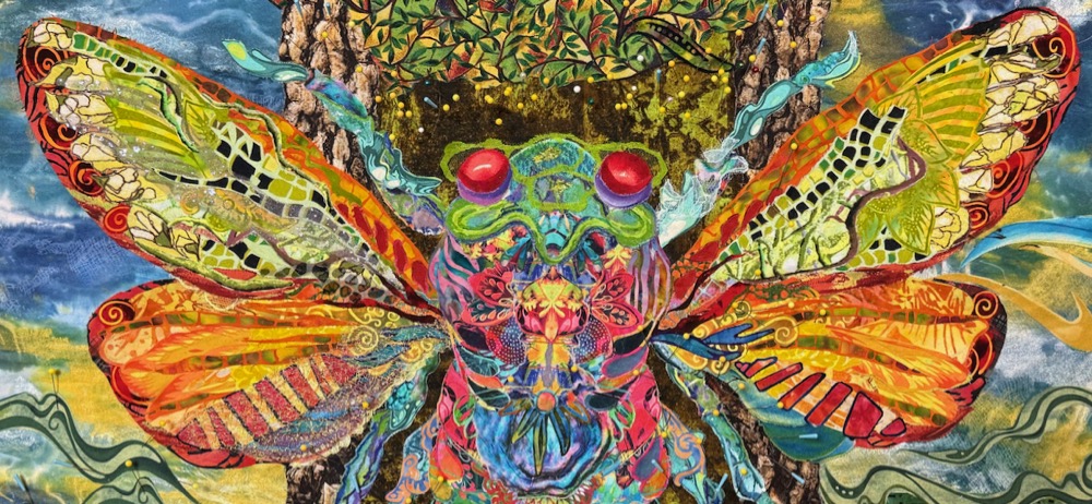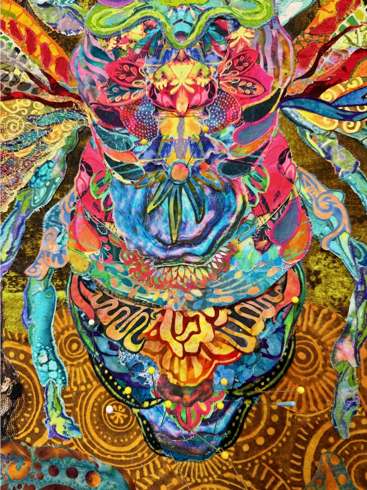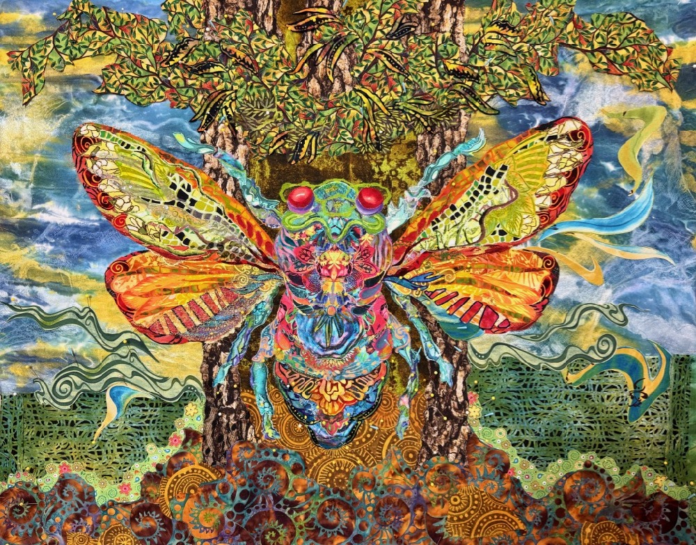 Last week in my studio, I had two true priorities to check off the list: 1.) pack for this week’s class at Woodland Ridge Retreat in Downsville, Wisconsin; and 2.) complete the second draft of my cicada fabric collage, as per the annotated notes from a previous week’s blog post. Travel is part of what I do, and once I get to my destination I enjoy where I’m at. However, the week or two before I head to the airport, I get travel stressed. It comes out as totally unreasonable to-do lists where everything I could possibly think of doing—this year, last year, and next year—needs to be done now. Maybe a few of you will understand that.
