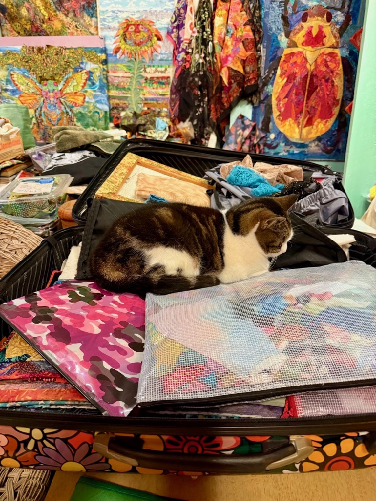 In any case, it was definitely more pleasant to be inside my studio. Djinni knows something’s up when the suitcase opens up to be repacked for the next class. It’s pretty much the same stuff inside, but needs to be checked out and cat-approved every time.