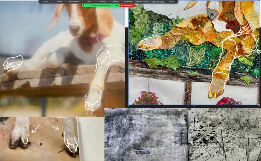 This week we bring you the in-progress fabric collage classwork of: Grace Crocker, Stacey Starr, Barb Grant, and Mary McKay. Enjoy!