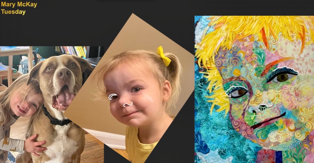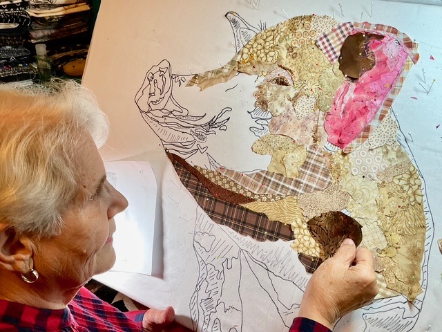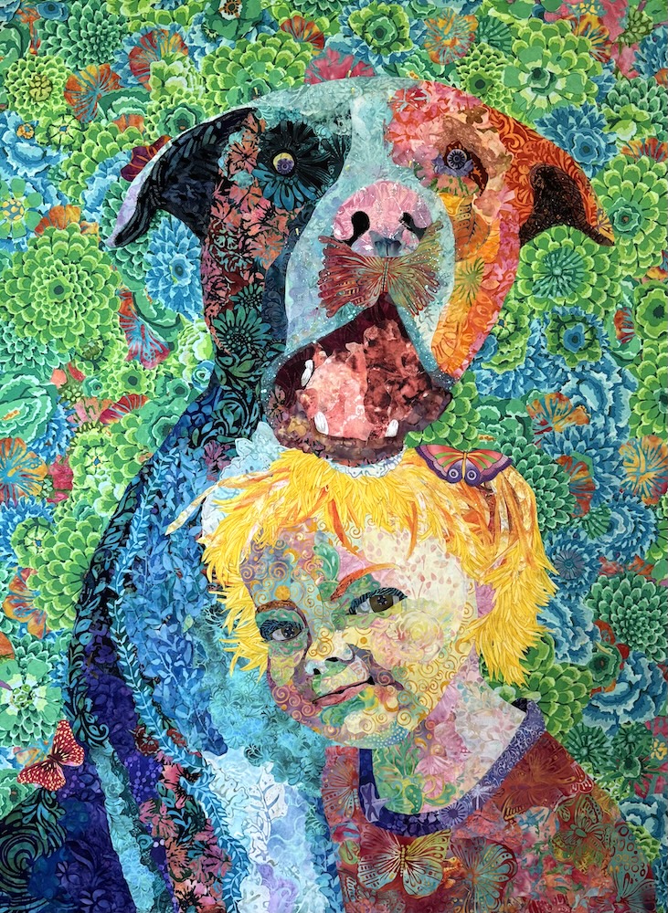 Mary joined us for only three days from Palm Desert—her goal for those days was to get the final niggly details finished on this so very colorful and adorable collage. It’s been a long journey for this portrait of little Lucy and her dog Homer. Mary took them through all three construction drafts—getting it down, fixing it up, examining every detail and editing if needed. Congratulations, Mary, you did it—they’re fantastic!