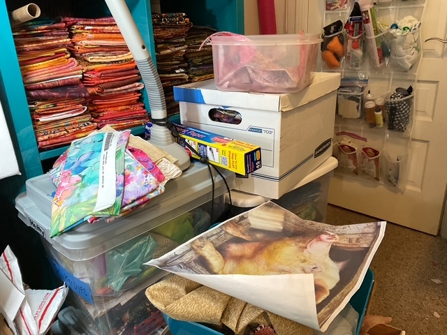 When I needed a reflection for the window Susan suggested that I use a photo of my own Bigfoot collage. Perfect! Background fabric is from Spoonflower. It’s all done now, one month later, except the top binding. I had to order another piece from Spoonflower to get the match I wanted.