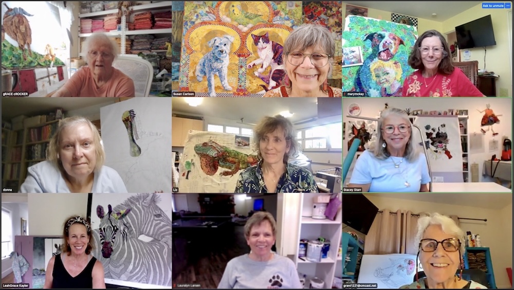 Both this week’s and next week’s posts will follow the progress of these talented women in this online class—including a few fun-to-see shots of their increasingly messy yet very productive creative spaces. “Show and Share” photos from our mid-week after-class evening together are included as well.
