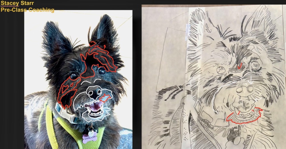 It is always incredibly inspiring to see the creative work of your students, Susan! Grace is a wonder, isn’t she?!! She is so prolific! I am fascinated by Barb’s choice to work with plaids–and I love Edison the pig. She’s got those plaid prints really working! Mary’s work is terrific. I admire her choice of a dark dog. Challenging, but her image is really progressing nicely. I look forward to seeing more from this class!