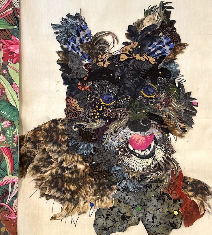 Stacey joined us from Franklin Lakes, New Jersey—her goal for the week was to get “life into the eyes,” as well as figuring out the nose and teeth, of her little “spitfire” mini-schnauzer, Shadow. She’s definitely capturing his energy with her collage style. By the end of class, Stacey was considering a jungle-like background (see strip of fabric showing on the left side of photo below), due to his hunting forays into the underbrush behind their home! Stacey’s stories of Shadow added to the fun of seeing this portrait come together.