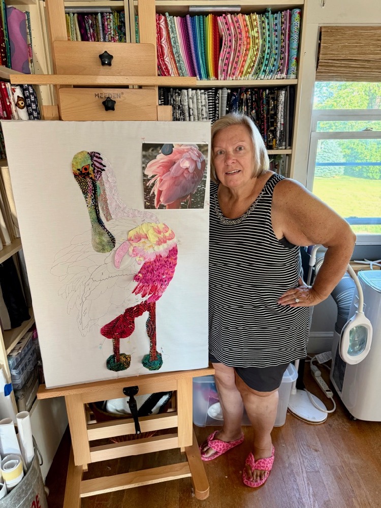 Donna joined us from North Hampton, New Hampshire—her goal for the week was to celebrate her recent retirement with the color pink! A second goal was to create a first draft of an appropriately pink-colored roseate spoonbill. Donna (as you would expect) has lots of large pink petaled flower print fabrics on hand to create layers of fluffy feathers to finish up that first draft—a great way to start her retired life—congratulations!