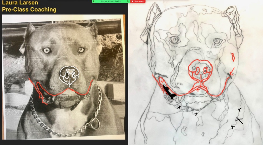 Laura joined us from Logan, Utah—her goal for the week was to get started on a portrait of Maynard, her son Brady’s “smiling dog.” Against all odds, she did get a good start, even with an unexpected need for 15 family members (mostly grandchildren) to stay at her house for the summer! Laura has a great smile and her priorities are clear. Maynard took a back seat, but Laura will be ready to roll when she has her own space again in October. I look forward to seeing Maynard come to life.