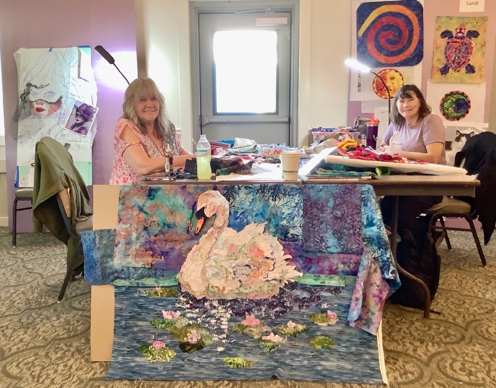 In front of the fanciful backdrop of finished quilts by Brenda Carter (above), Liz and Darlene discuss the background of Darlene’s portrait of “Sal.”