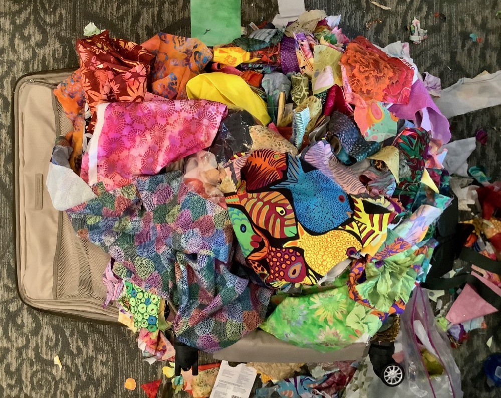 Anyone who has attended one of my classes, knows that I ask housekeeping not to vacuum the floor for the duration of the class—those bits that drop from our scissors can become valuable finds before the end. You can see the transition in the photos above: Darleen, beginning to pull from her suitcase of fabric on day one; Nan, relaxing with her wonderfully tousled stash on day nine.