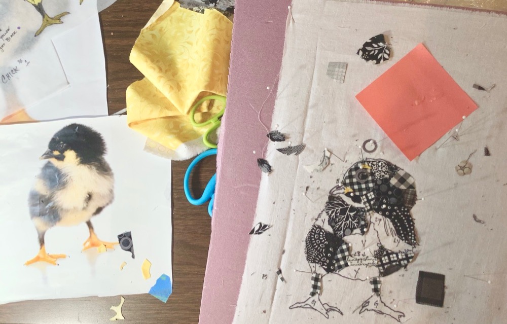 Barb and her husband Irv, made their cross-country trek to Bar Harbor from Pacific Grove, California. Barb attended the Bar Harbor 2024 class where she began Montgomery the Rooster. I’ve know Barb and Irv for years (more than we can figure out) and I have fun when I’m around them. Barb has a larger goal of collaging a “Plaid Barnyard” of animal characters that contain collaged plaids and checkerboard fabrics. She has Edison, a plaid pig in the works, but these two weeks concentrated on Montgomery’s family.