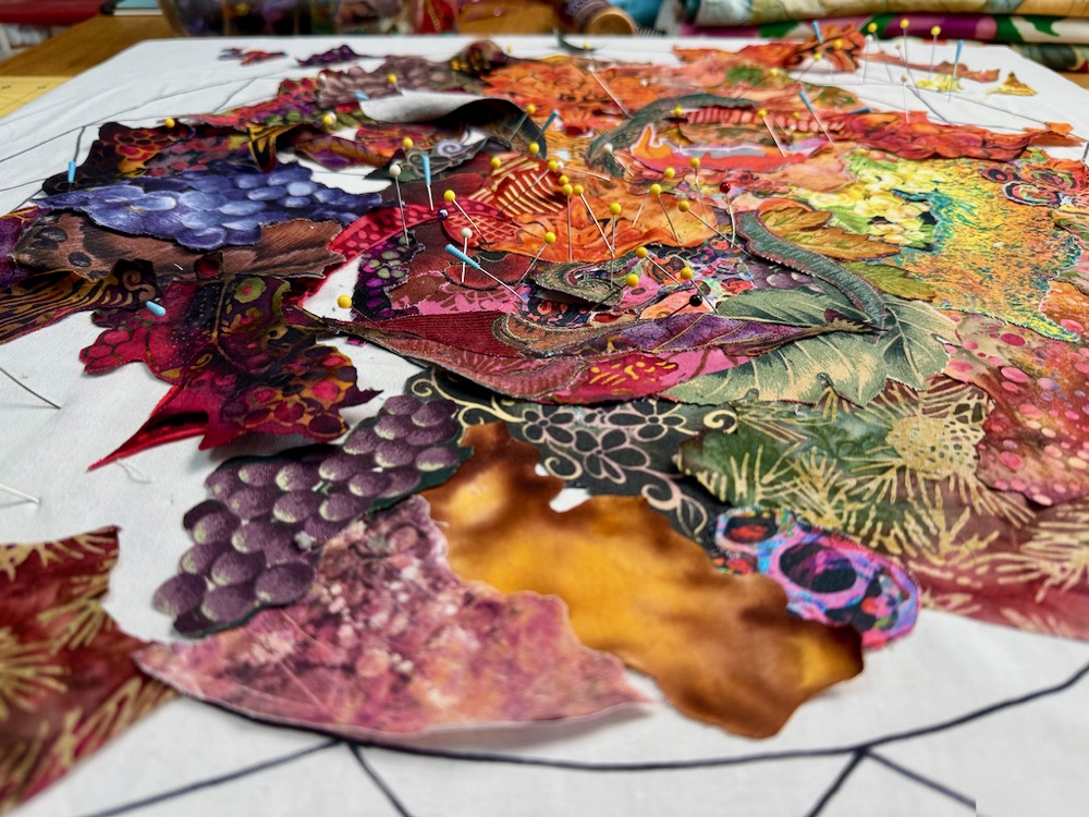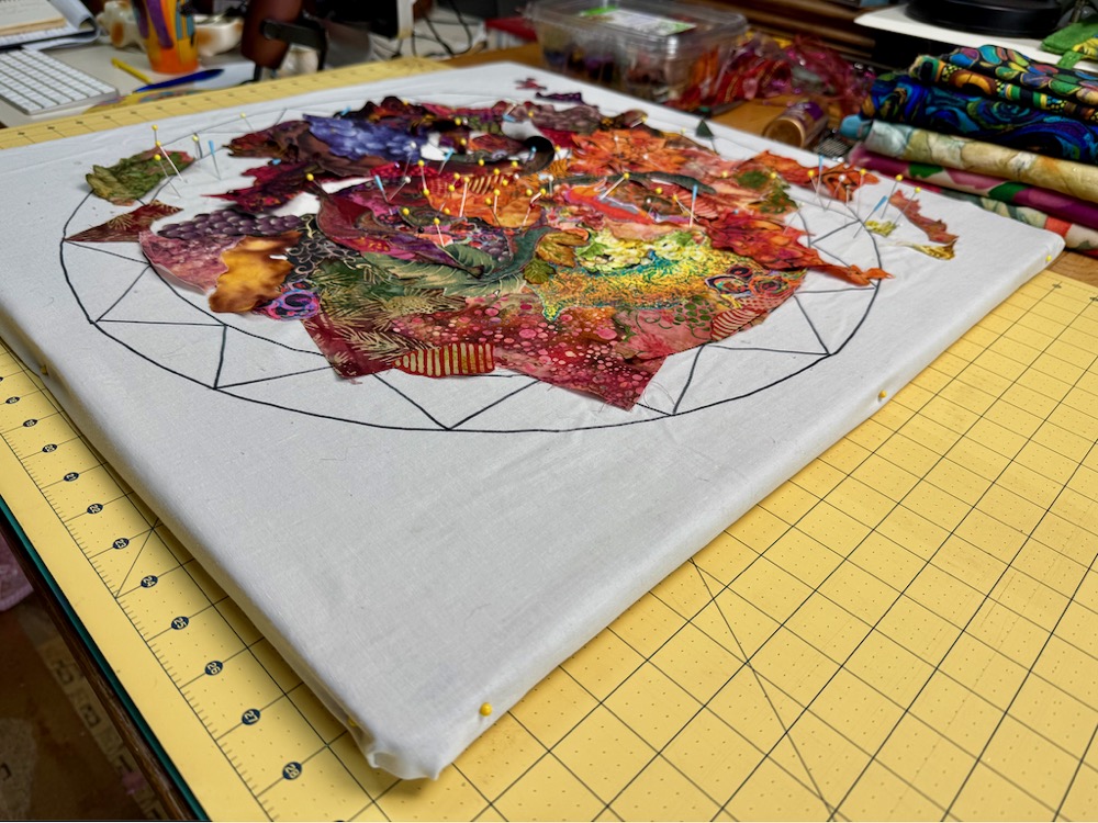 A piece of foundation fabric lies beneath a fabric collage. It’s nothing to be scared about—except for the “messy-scary” stage every collage goes through—see above and below photos to confirm that.
