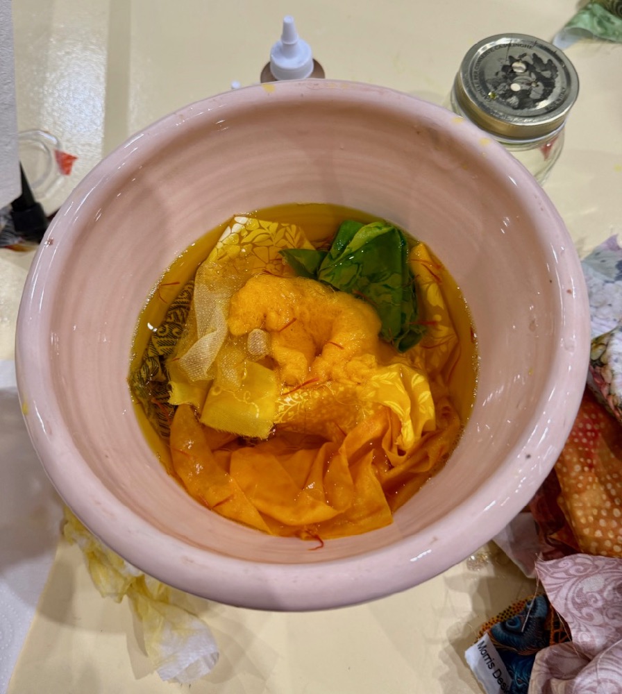 Since the longer the dye steeps the stronger it will become, and the longer the fabric soaks, the brighter it will become, our saffron “day” became three days. The dye sat overnight in mason jars, then our fabric sat overnight in the bowls of dye.
