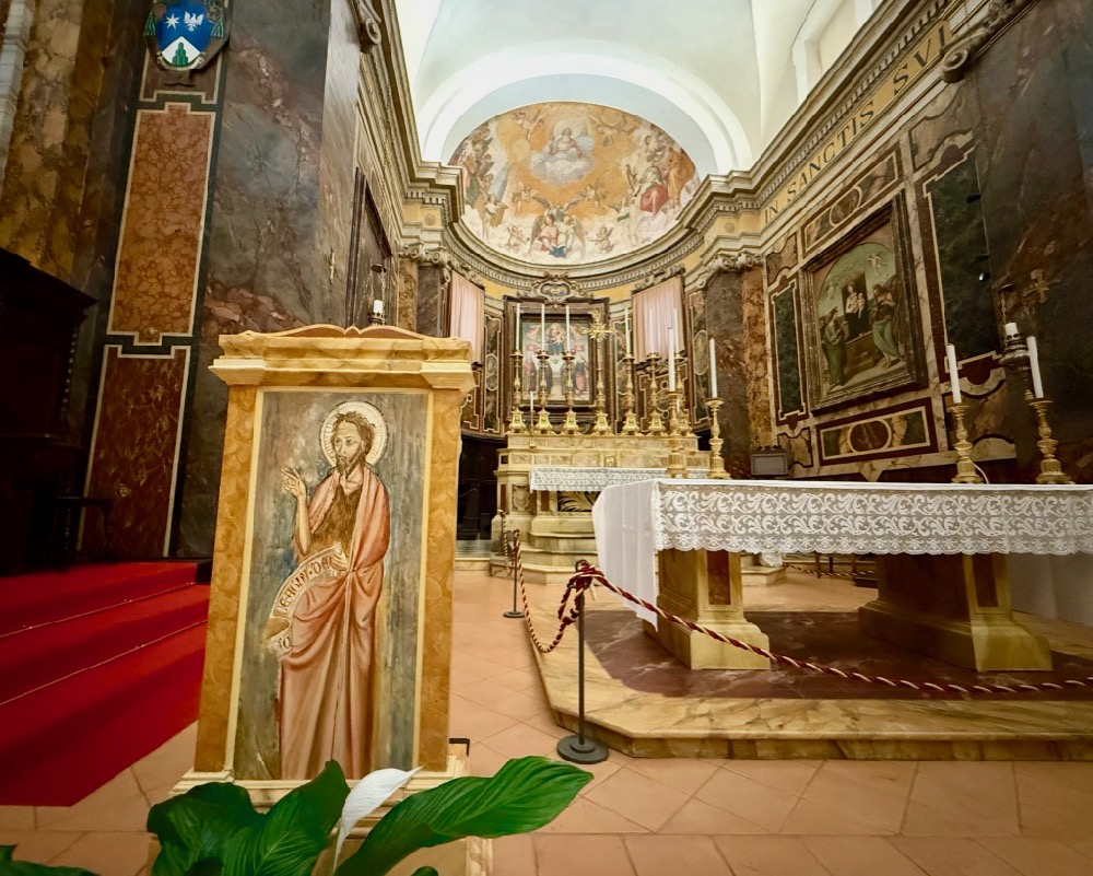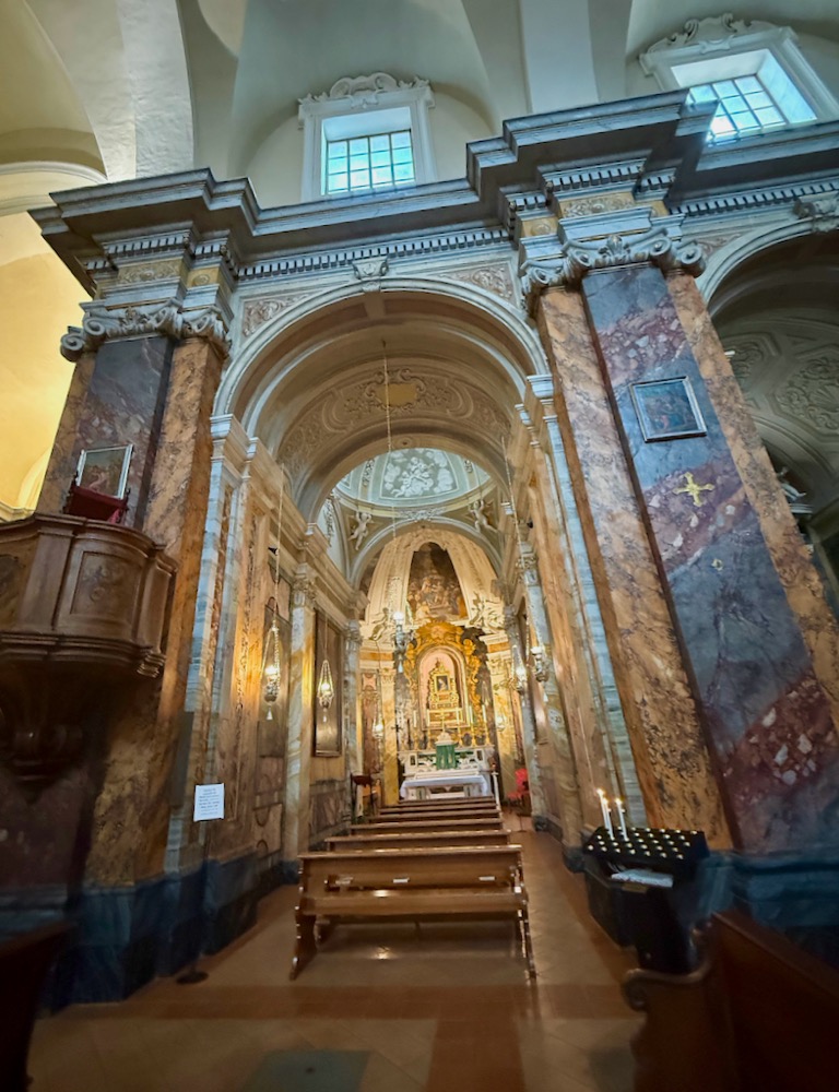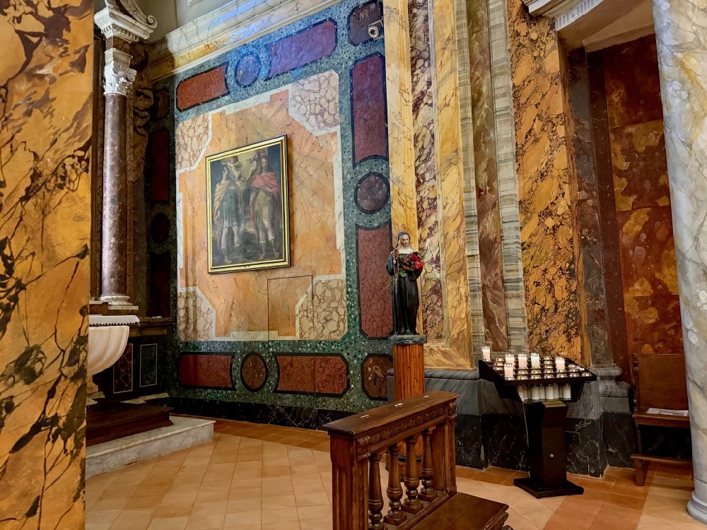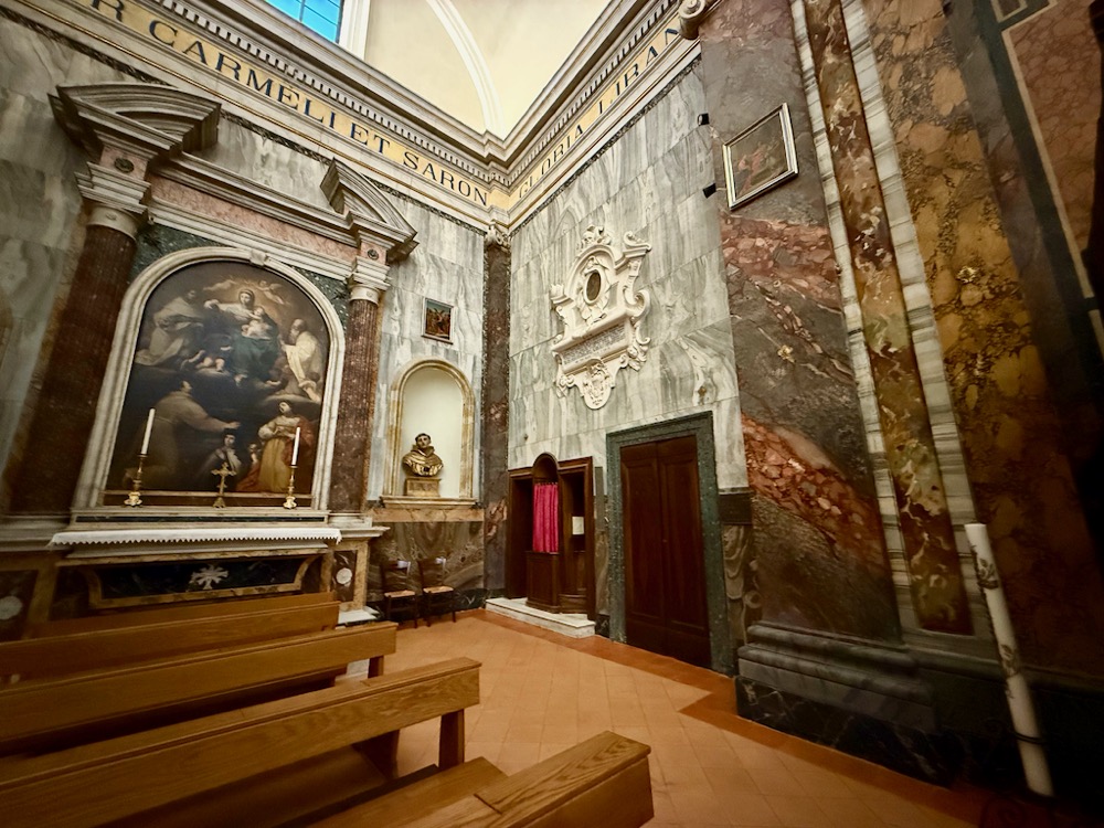 Pamela called our attention to the marble surfaces. Except they’re not marble. It’s all paint—faux marble and inlay, even the carved ceilings and decorative trim—I was captivated by the artistry of the walls and ceilings, columns and pillars, the altars and steps. I wonder if painted wood, even if we don’t know it to be, gives a warmer impression of a space than real marble would?
