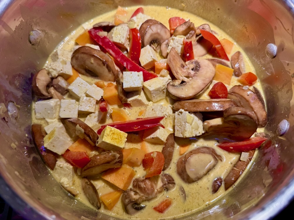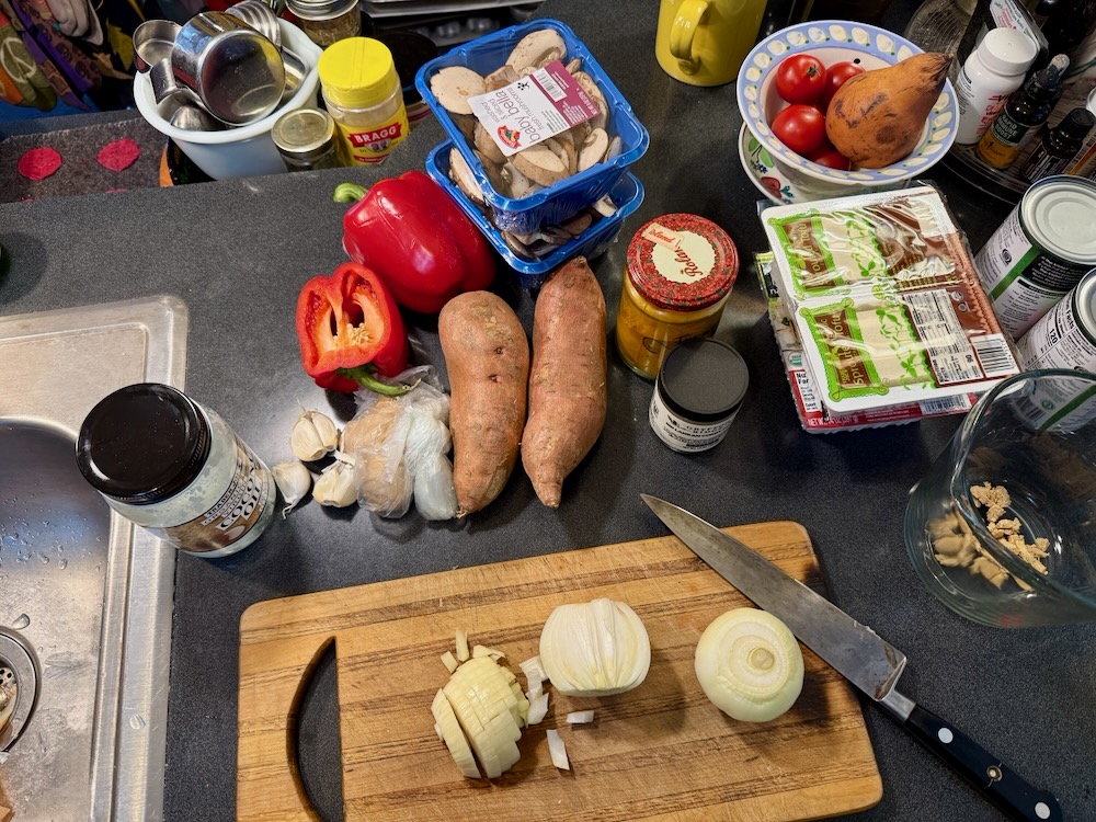 I’m including this third sweet potato curry recipe partly because I seem to crave that combo in the winter months (and maybe you do too), and also because it uses a slow cooker—very handy for busy weeks. I think I’ve only made it once quite awhile ago, and I can’t remember specifics about it. However there’s red lentils in the ingredients and I’ve got some to use up, so I’ll put this on the menu for early March when both Tom and I will be occupied with our 5-Day Live Online Fabric Collage Class.