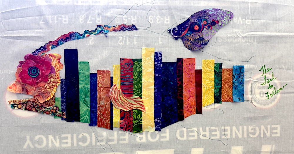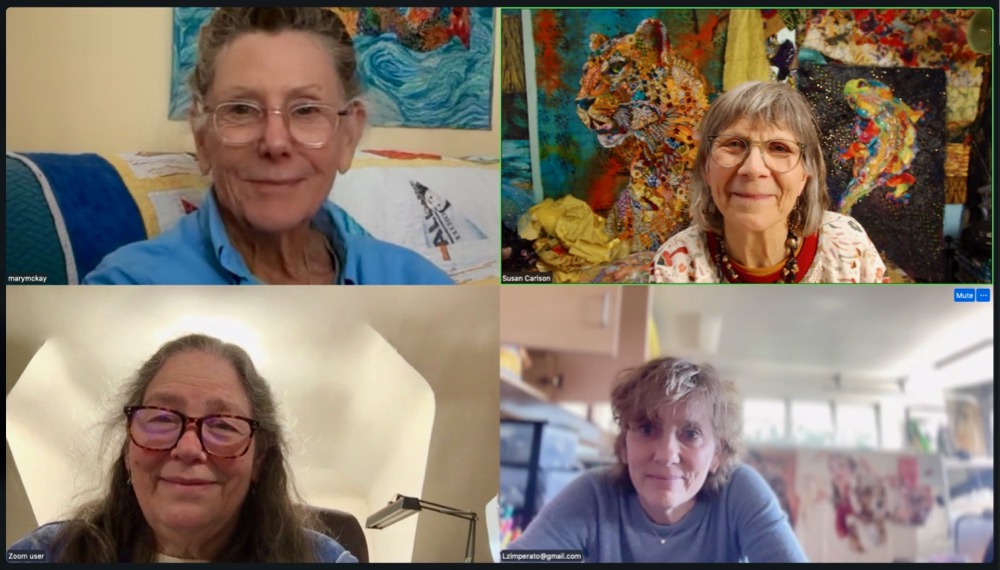 This week I bring you the in-progress fabric collage classwork of: Liz Imperato, Alice Magorian, and Mary McKay. “Show and Share” photos from our mid-week after-class evening together are included in each section as well.
