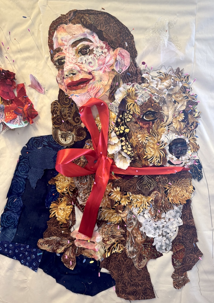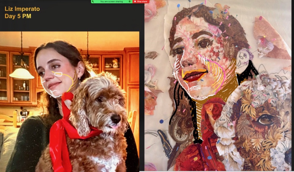 Goal #2, which Liz decided was best to begin in this class, was a double portrait of her daughter Emily, and Emily’s dog Winnie. Liz is a prolific collage artist but knew she’d need to slow down a little for this one—and sure enough, step-by-step it’s coming along.