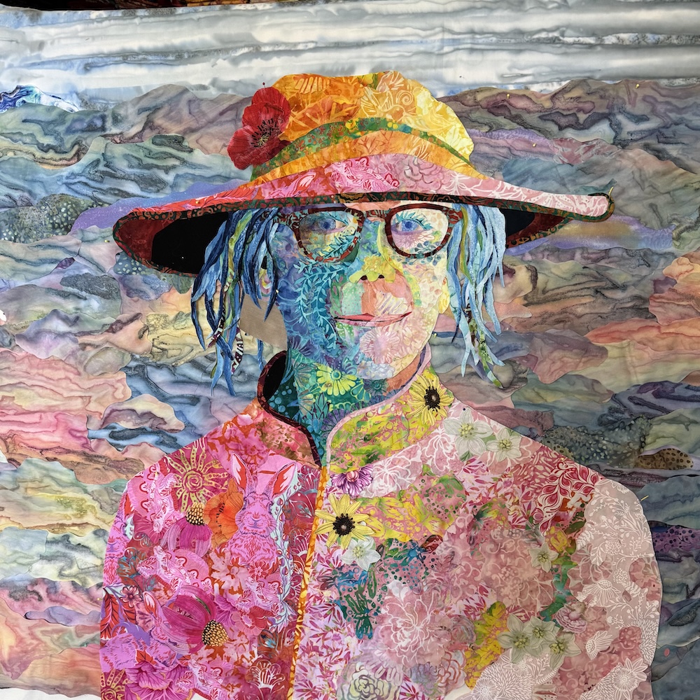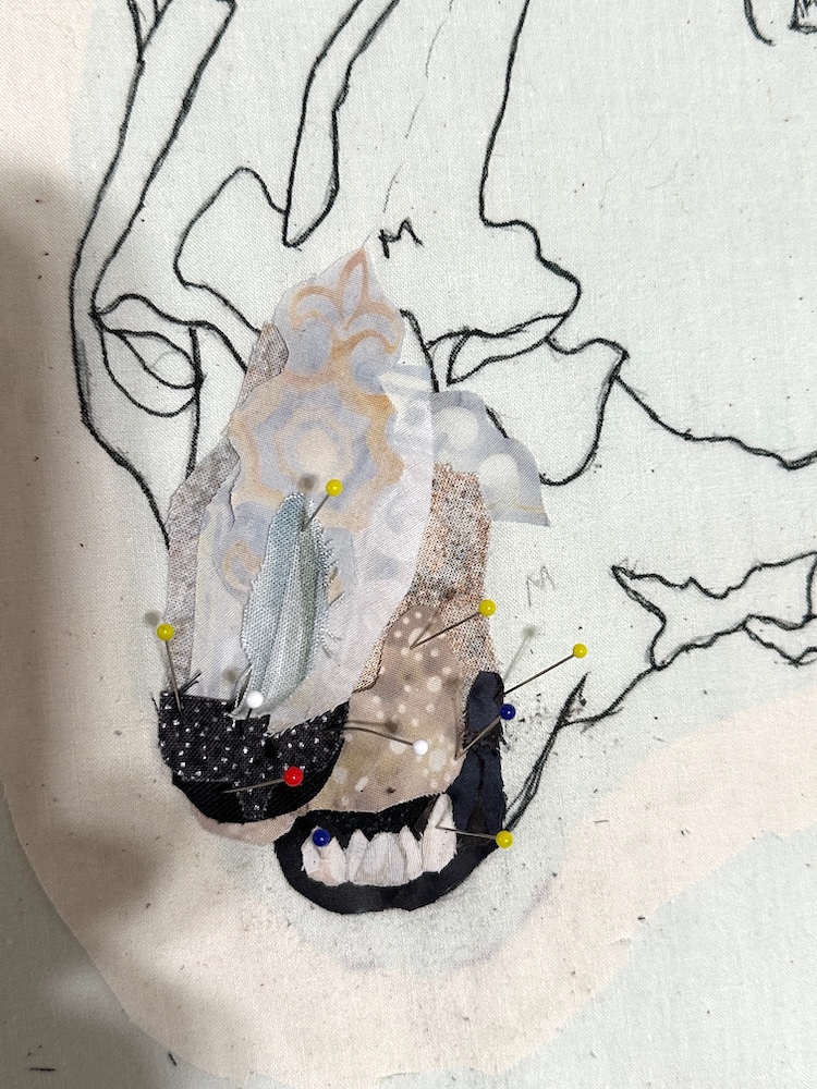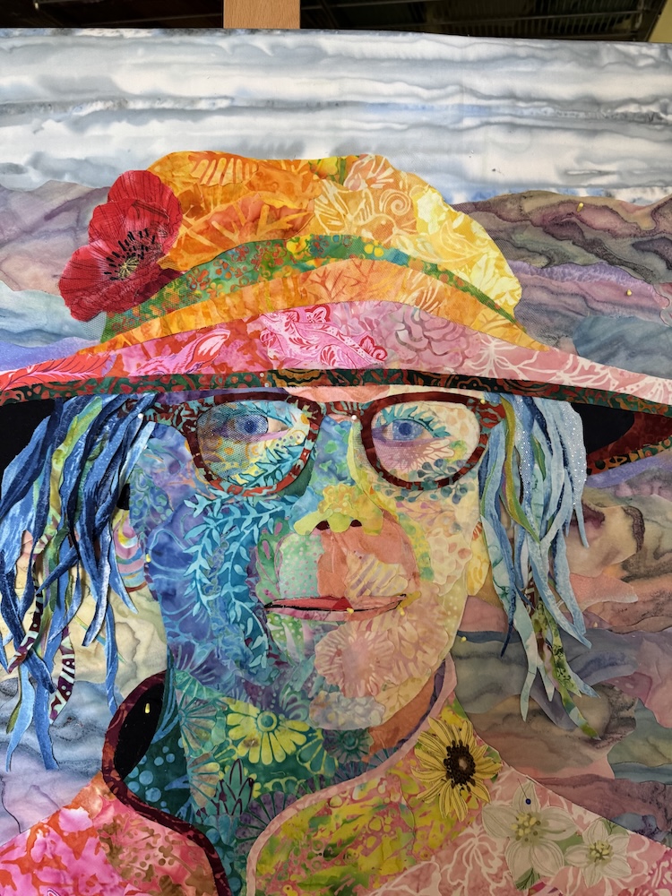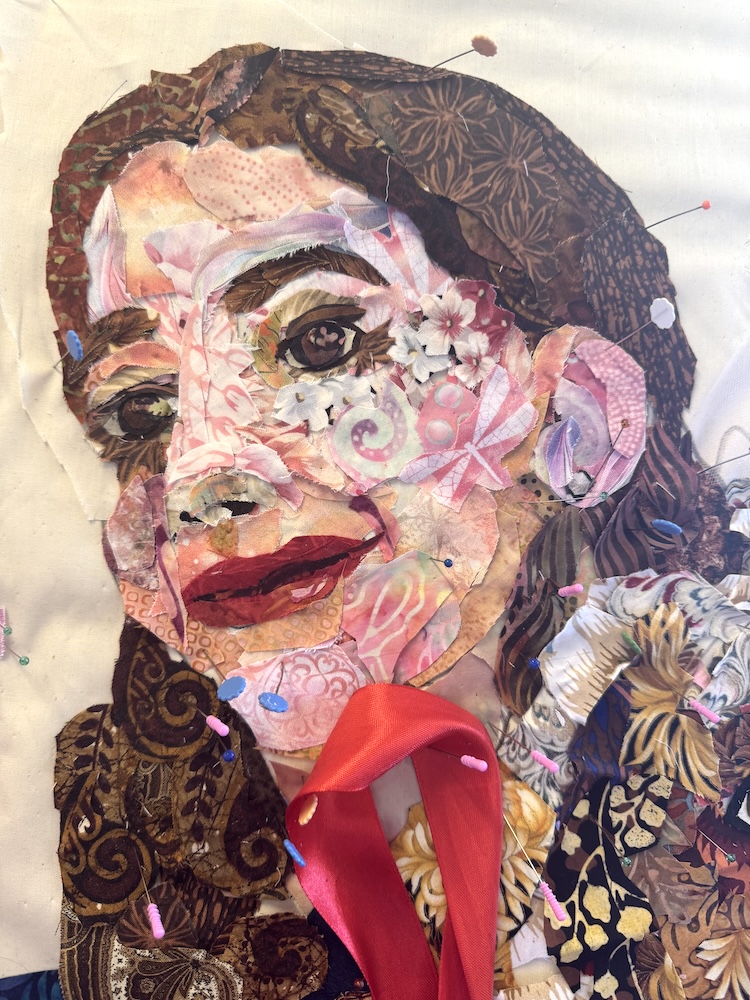 The next day I stood in front of my now very tidied fabric inventory and pulled blue and aquas and lights. I decided to limit myself to what was in front of me and started with the face. I repeated the same process for each area of the piece. In three weeks I had an almost complete hat, face, and shirt. I limited my usual second guessing. Pick a color, cut it, put it down. Repeat. That was a first.