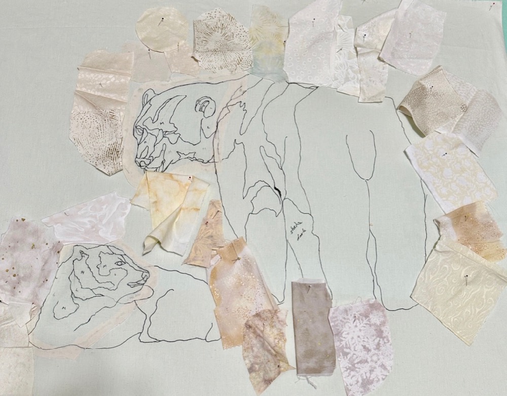Alice logged in to the class from near Baltimore, Maryland. She had visited Canada last year to see polar bears as they gather before heading to their ice-covered winter hunting grounds. Beginning a collage to capture a mother and cub she photographed was her intent for this week, though she added that her goal was to continue working in fabric collage with more coaching. She already took a step in that direction by becoming a member of Patreon at a level where she can receive monthly feedback on her work.
